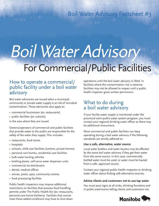 For More Information about Boil Water Advisories in Manitoba for Commercial or Public Facilities Click Here