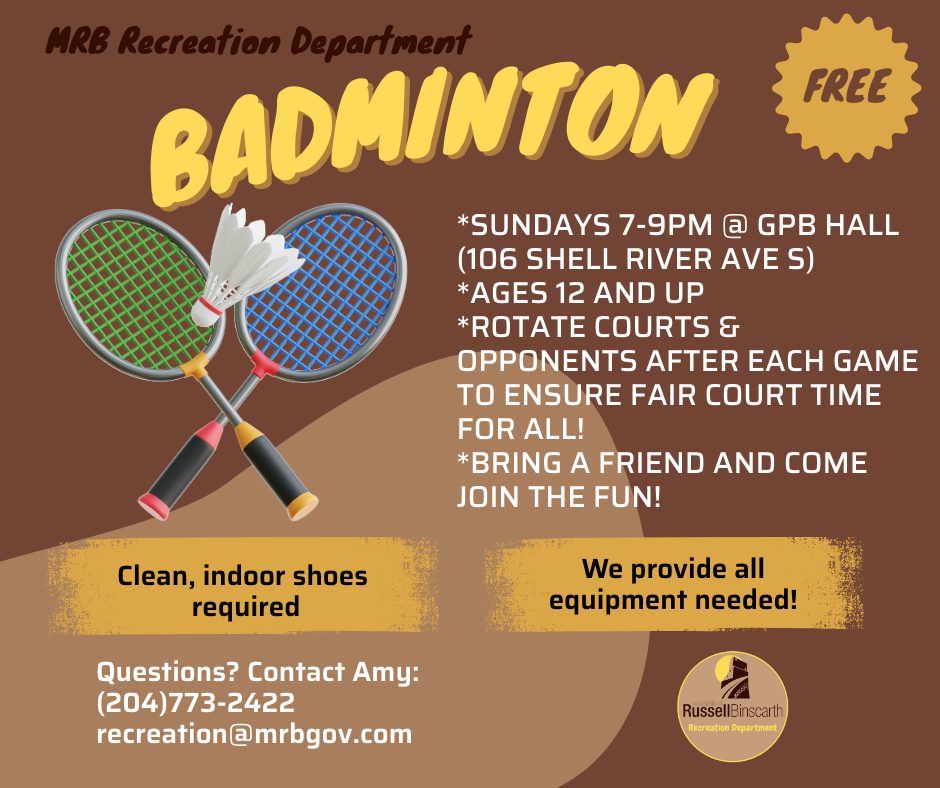 All skill levels welcome! Racquets and birdies provided! This is FREE and located at the George P. Buleziuk Centre (106 Shell River Ave S). Ages 12 and up under 14 must be accompanied by an adult.