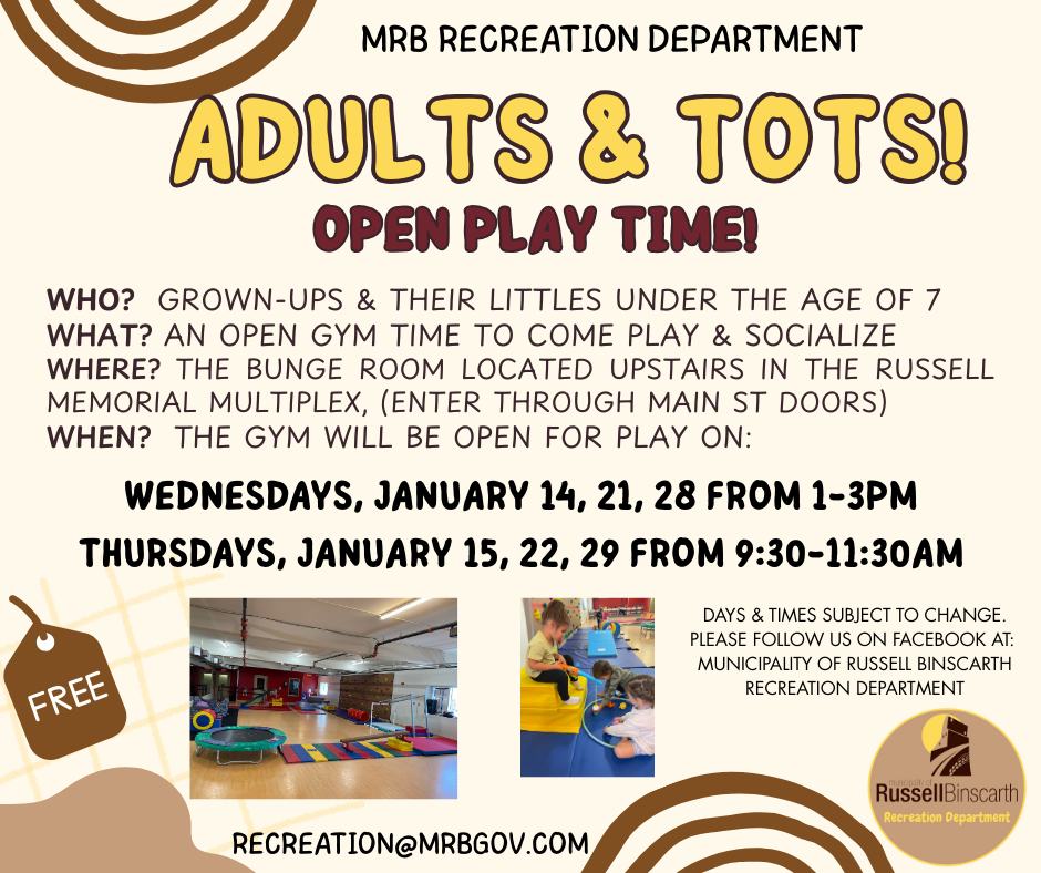 Adults and Tots! Wednesdays (1pm-3pm) and Thursdays (9:30 am-11:30 am) upstairs in the Bunge Room of the Russell Memorial Multiplex (Main St entrance) This is a FREE program for kids and their grown-ups. It is an “open gym” type setting, where kids 5 and under can come and play on the Gym Kids equipment while being supervised by their grown-up. All welcome.